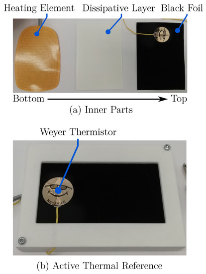 In order to determine both the slope correction and the offset of the temperature calibration, a heatable black body was developed and used as an active thermal reference. Therefore, a heating foil (Thermo, Germany) and a more than emittive, black coated aluminum foil (Advanced Coating, Germany) were integrated into a 3D-printed ABS housing, resisting temperatures of at least . Both foils are separated by a thin layer of ABS, which is supposed to cause a more homogeneous temperature distribution in the black foil. To obtain the reference temperature, a Weyer skin temperature probe (Weyer, Germany) was placed on the black foil. These adhesive thermistors are clinically used as the gold standard for neonatal skin temperature measurements and have a range of –. The maximum error of the probes were specified as ± [32]. The active thermal reference body is shown in Figure 4.