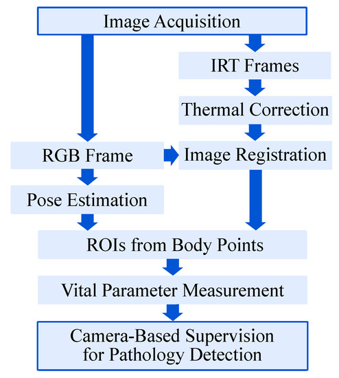 The infrared images and the RGB frame were then registered and transformed, allowing both image modalities to have the same Point-of-View (POV). Afterwards, the RGB frame was used to determine the ROIs using a body pose estimation (BPE) algorithm. Before obtaining the desired vital parameters, the thermal correction on the transformed infrared images was done. Finally, the PPGI signal for HR detection and the temperature values were extracted from the RGB and the IR image, respectively. The single steps of the algorithm are explained in more detail in the following section.