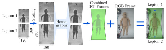 Regarding the image registration, a manual approach was chosen by selecting ten points on the IRT image and the corresponding feature points on the RGB image. Using the Ransac algorithm [33] for optimal matching, these feature were taken to determine a 3 × 3 homography matrix H, which can rotate, translate and distort the Lepton images to match the RGB image. As the Leptons have a fixed position in their housing, the manual labeling process described above was only done once. The registration process is shown in Figure 6. After rescaling of both Lepton frames, they were transformed using the homography matrices and to create the combined IRT image. The overlapping region was filled with temperature data from Lepton 1 that mainly records the upper body.