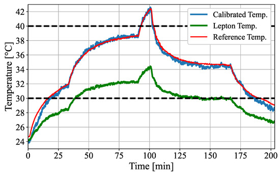 The calibrated temperature was well-fitted to the reference temperature, which was recorded using the gold standard temperature probe. Since the thermal calibration was optimized for the temperature range of 30–40 , calibrated temperatures below or above this range deviated more from the reference. In addition to the temperature curves in Figure 8, the mean absolute error (MAE), the standard deviation (STD) as well as maximum (MAX) and minimum (MIN) error of both measurements (Lepton 1 for fitting and Lepton 2 for validation) are presented in Table 4.