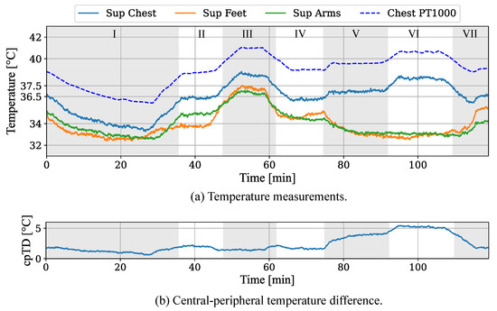 Until the end of phase IV, the cpTD was less than 2 (cf. Figure 9b). The next phases V and VII simulated a rising cpTD by slightly increasing the temperature of central body parts while simultaneously decreasing the set value for the peripheral areas. The progress of the measured cpTD can be observed in Figure 9b. While phase V showed a cpTD of 4 in the steady state after the cooling of arms and feet, phase VI revealed a cpTD of almost 6 due to an increase in central temperature. The final phase VII shows the return to the initial physiological temperature values.