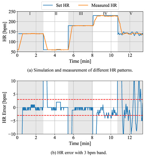 In the beginning of the simulation (phase I), a physiological HR of 140 bpm was set. Subsequently, the set HR was reduced to a value less than 60 bpm in order to prove the simulation of a severe bradycardia in phase II. In phases III and IV, the HR was increased to values near a tachycardia (180 bpm) and then to a severe tachycardia (230 bpm). Finally, the HR was changed back to a physiological (140 bpm) in phase V with a simulated HRV. In Figure 10b, the HR error can be observed. The dashed red lines describe the error margins of ±3 bpm. Since the HR was computed using a sliding-window approach with a window length of 30 s, the prediction error for the extracted HR regularly increased during transient phases. For phases I to IV, a mean absolute error of 0.89 bpm can be observed. In contrast, the mean absolute error increased to 4.62 bpm in phase V with a simulated HRV. The calculated errors only include the time periods, where the measured heart rate already reached the set point. As can be observed in Figure 10, the results show an accurate camera-based measurement of the HR in the phases using the implemented setup.