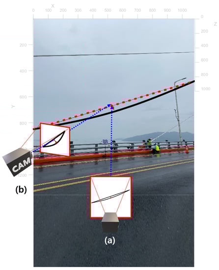 The displacement estimated by using the conventional vision-based displacement measurement methods may contain large error depending on the camera location. When the cable displacement is parallel to the camera plane as shown in Figure 1a, the displacement of the structure can be accurately estimated by applying the conventional tracking algorithm. However, when using the vision-based displacement measurement method in the actual field, it is often difficult to install the camera perpendicular to the cable displacement. For example, when installing a camera at the opposite side of the bridge, the line of the sight might be blocked by an obstacle such as a vehicle. The line of sight of the camera can be secured when the camera is installed next to the cable as shown in Figure 1b. However, in this case, the displacement estimated using the side view camera will contain project error due to different field of view. Therefore, this study introduces a new method to estimate the displacement of the cable using the side view camera, even when the displacement of the cable-stayed bridge does not coincide with the camera plane.