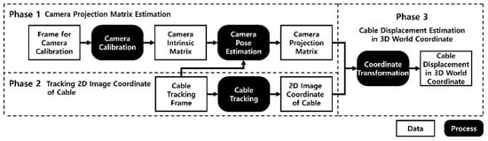 The proposed method for measuring the cable displacement using a side view camera is consist of three phases, as shown in Figure 2. First, a camera calibration process is conducted in phase 1 to remove radial distortion and to obtain camera projection matrix which contains the camera intrinsic parameters and the pose of the camera. Next, in phase 2, the feature points in the cables are tracked in the image coordinate. Finally, in phase 3, the displacement of the cable in the world coordinate can be calculated by combining the information from phase 1 (i.e., camera projection matrix) and phase 2 (i.e., tracking result in 2D image coordinate).