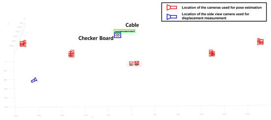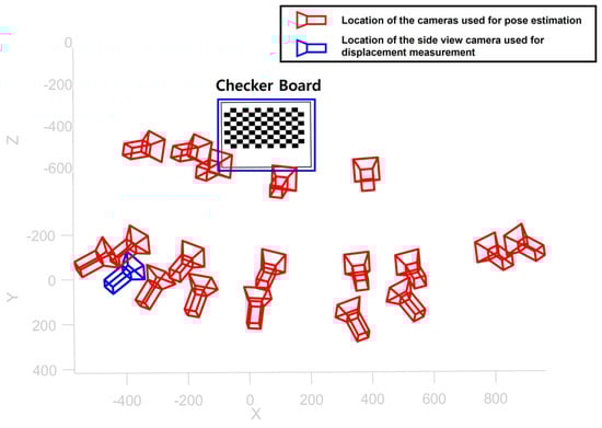 The position (rotation and translation) of the camera estimated using the camera calibration is shown in Figure 7. Since the simulation test was performed in an ideal environment, the reprojection error was 0.02081. As a result, the intrinsic matrix was calculated as [8939.9, 0, 0; 0, 8940.4, 0; 680.5985, 796.9211, 1], and the rotation matrix and translation vector for the side view camera were obtained as [0.4329, −0.3142, 0.8449; 0.9013, 0.1369, −0.4110; 0.0135, 0.9394, 0.3425] and [123.2153, −13.6199, 2636.6], respectively. Finally, by combining the intrinsic matrix and the extrinsic matrix, the camera projection matrix was calculated as [4445.5, −2136.0, 0.8449; 7778.1, 896.2860, −0.4110; 353.6296, 8671.8, 0.3425; 2895,613.3 1978,938.5, 2636.0].