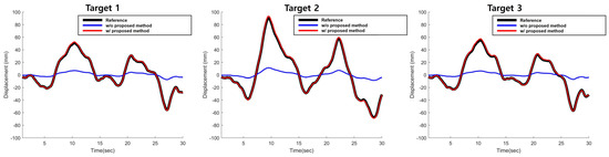 The RMSE (root mean square error) of the displacement is shown in Table 1. The proposed method showed RMSE of 0.7001 mm, 1.2789 mm and 0.9579 mm, respectively, for each target, while the RMSE of the displacement without proposed method were of 20.6601 mm, 32.6588 mm and 22.6273 mm. The proposed method could reduce the average RMSE from 25.3154 mm to 0.9790 mm.