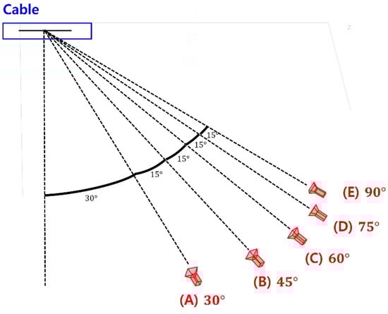To quantitatively analyze how much the angle affects the performance of the proposed method, the simulation-based validation test was repeated by changing the angle between the plane of the camera and the plane of the cable displacement from 30° to 90°. The camera was assumed to be installed at 3 m away from the cable, as shown in Figure 9. The estimated displacement using the proposed method and the traditional KLT tracker (without compensating the side angle effect), compared to the reference displacement, which is shown in Figure 10, and the RMSE, which is shown in Table 2. As shown in the figure, the displacement estimated using the proposed method and the displacement using the traditional KLT were almost identical to the reference displacement when the camera was installed at an ideal location (no side angle). When the angle between the plane of the camera and the plane of the cable displacement was 30°, the RMSE for the traditional KLT was 1.5135 while the RMSE for the proposed method was 0.4356. When the angle increased, the RMSE for the traditional KLT significantly increased while that of the proposed method increased slightly. When the angle reached to 80°, both the proposed method and the traditional KLT tracker were not able to estimate the cable displacement because the feature points in the cable were not visible.