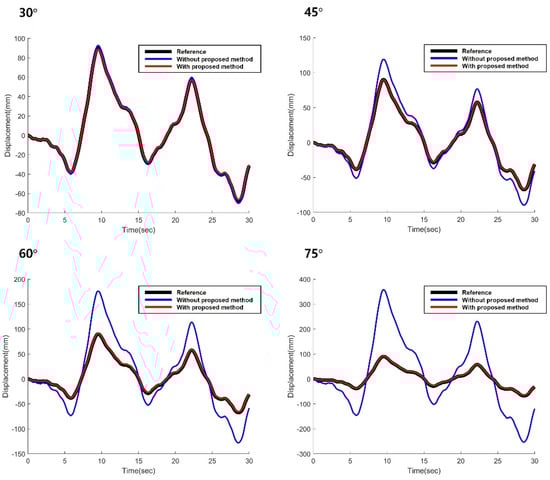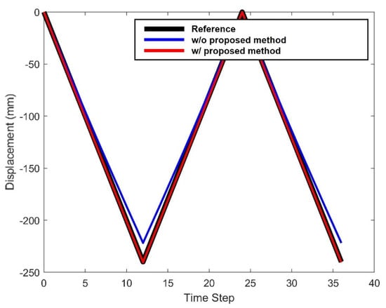Once the camera projection matrix was obtained, the displacement of the side view video was calibrated using the proposed method. Figure 8 illustrates the displacement results of the simulation validation test. To evaluate the performance of the proposed method, the calibrated displacement using the proposed method (red line) was compared with the reference displacement (black line) and the displacement without proposed method (blue line). As the figure indicates, the proposed method was able to estimate the displacement even with the side view, while the without proposed method) showed a significant difference with the reference displacement.