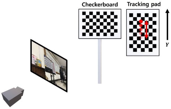 A lab-scale validation test was conducted to validate the performance of the proposed method in physical environment as shown in Figure 11. To obtain the reference displacement accurately, the lab-scale validation test was conducted by tracking a point in a tracking pad. Points in the tracking pad was assumed to moved only in the Y-axis direction. The video was recorded by a side view camera with 4032 × 3024 resolution and 30 fps which was installed about 70 cm away from the checkboard.