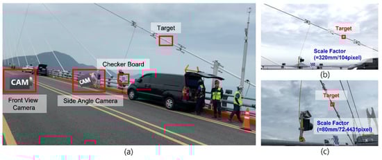 On-site validation test was conducted at Cheonsa Bridge, South Korea to seek the applicability of the proposed method. The configuration of the on-site validation test is shown in Figure 14a. A target was attached to the cable to be measured, and a checkerboard was installed next to the cable. The axis of the global coordinate system X, Y, Z was defined according to the checkerboard. Two cameras with resolution of 3840 × 2160 and 30 fps were installed at the site, one camera with a front view (Figure 14b), and another camera with side view (Figure 14c). The front view camera was installed approximately 15 m away from the checkerboard, and the side view camera was installed 3 m away from the checkerboard.
