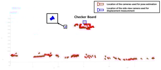To estimate the pose of the side view camera, a total of 237 images were taken from various locations with different angles as shown in Figure 15. The reprojection error for the camera calibration was 0.3563 pixels, which was higher compared to the simulation and the lab-scale test. As a result of, the intrinsic matrix was estimated as [3102.2, 0, 0; 0, 3081, 8, 0; 1.938.8, 1043.8, 0], and the extrinsic matrix of the side view camera was estimated as [0.4706, 0.2781, 0.8374; 0.0671, 0.9350, −0.3482; −0.8798, 0.2201, 0.4214]. By combining the intrinsic matrix and the extrinsic matrix, the camera projection matrix was calculated as [3083.4, 1731.1, 0.8374; −467.0903, 2518.0, −0.3482; 8818,250.5, 6901,126.8, 3654.1].