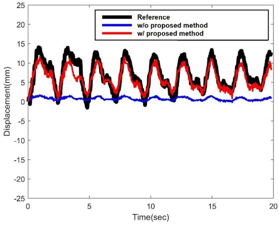 Figure 13 shows the results of the displacement without (blue) and with (red) applying the proposed method. The error for both methods were lower than the error of the simulation-based validation test, since the camera was installed at a closer distance and the tracking error was negligible. The RMSE of the displacement without the proposed method was 9.0292 mm, and the RMSE of the displacement with the proposed method was 0.9318 mm. From the result, it can be concluded that the proposed method can significantly reduce the error of the displacement by compensating the projection error of the side view video.