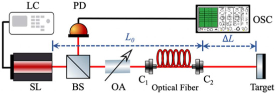 Schematic diagram of the SLOF sensing system. SL: semiconductor laser; LC: laser controller; BS: beam splitter; C: optical fiber coupler; PD: photodetector; OA: optical attenuator; OSC, oscilloscope. : initial external cavity; : distance to be measured.