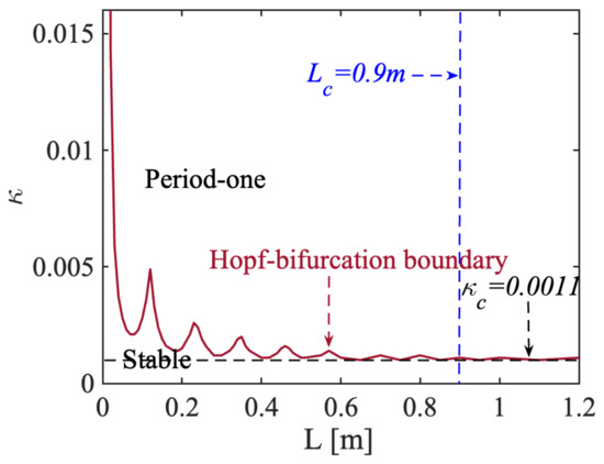 State diagram for an SLOF sensing system. Red line: Hopf-bifurcation boundary, where period-one state is above the boundary and stable state is below the boundary. Blue vertical dash line: critical external cavity length . Black horizontal dash line: constant feedback strength .