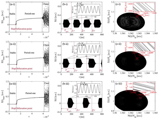 To further examine the switching period feature between the stable state and the period-one state in a long-cavity region, we kept the initial external cavity length fixed at 1.5 m, and . The total external cavity length was set at 30 m, 37.5 m, and 45 m, respectively, and their corresponding external cavity round trip times were 200 ns, 250 ns, and 300 ns, respectively. The relevant bifurcation diagrams were drawn and are shown in Figure 3a. As we were interested in the influence of the feedback strength on the SL states, we varied from 0 to 0.007 with a step size of 0.0001. At each , we obtained the corresponding maximum intensity , and presented it on the bifurcation diagram in the () plane. Different states were indicated with their corresponding ranges. The bifurcation diagrams shown in Figure 3a clearly indicate the evolution route of the nonlinear dynamics in the SLOF system with an increasing , which moves from a stable state, period-one state, to chaos state. An undamped relaxation oscillation occurred after the Hopf-bifurcation point; in this case, the SLOF system could enter the period-one state. The laser intensity with a square wave-like envelope from the SLOF was observed and is shown in Figure 3b with near the Hopf-bifurcation boundary. It can be seen that the laser intensity signal showed a switching between the stable state and the period-one state. The relevant details of black areas can be read from the corresponding inset figures. In the period-one state section, the laser intensity exhibited a high frequency oscillation (denoted by for its peak frequency) shown in the inset of Figure 3b. Without the need for any high-speed electronic or optical modulation devices, microwave signals with square wave envelopes could be generated by utilizing the inherent dynamics of the SL with OF. Let us define the duty cycle as the time duration of period-one state over the square wave signal period in the time-series signal. The duty cycle shown in Figure 3(b-i)–(b-iii) are 75%, 63%, and 47%, respectively. These resultant square wave-like signals have potential applications to radio-over-fiber delivery of timing signals. Additionally, the SLOF system provides a possibility for the generation of a tunable square wave signal generation. In particular, the square wave signals shown in Figure 3b clearly indicates that the switching period is equal to the external cavity round trip time . It can be better understood by using the phase space diagrams shown in Figure 3c. It can be seen that, in each phase space diagram, there are mickle concentric annular circles and that each phase space diagram is also a coexisting stable limit cycle attractor, which indicates that the amplitude of the period-one oscillation gradually increased during the transition of the time-series signal from the stable state to the period-one state and, furthermore, that the oscillation frequency remained unchanged. These features realize the regular conversion between two nonlinear dynamic states at the Hopf-bifurcation boundary.