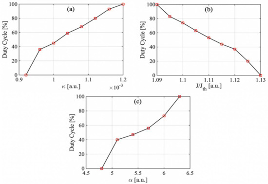(a) Influence of on duty cycle with , , and (). (b) Influence of on duty cycle with , , and (). (c) Influence of on duty cycle with , , and ().