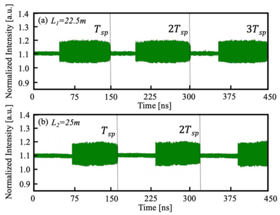 We conducted a series of experiments and generated under different to verify the proposed SLOF sensing system. An experimental setup is implemented according to the schematic diagram depicted in Figure 1. The laser source used in the experiments is a single-mode SL (Hitachi, Tokyo, Japan, HL8325) with a wavelength of . This SL is driven by the laser controller (Thorlabs, Newton, USA, ITC4001). The working temperature was T = 24.000 °C, the injection threshold current was , and the injection current was chosen at . A small piece of mirror was used as the external target to provide sufficient optical feedback. The OA in Figure 1 is used to adjust optical feedback amount in the experiment. The light is split via a 50/50 BS and a direct part of light went into the external PD (Thorlabs, Newton, USA, PDA8GS). A high speed OSC (Tektronix, Beaverton, OR, USA, DSA70804) with a maximum sampling rate of and analog bandwidth of was used to observe square wave signals. As examples, we performed two different experiments to test our proposed SLOF system. In experiment 1, we denoted the total distance as , in experiment 2, we denoted the total distance as . For the convenience of the experiments, with the aid of fiber, we experimentally implement a long-distance sensing system that has the initial external cavity length . Then, the target was placed away from the fiber end with and , respectively. The related experimental square wave signals can be observed and recorded by the OSC and shown in Figure 6a,b. From the experimental signals, we can determine the are 150.04 ns and 166.68 ns, respectively. Therefore, by using the relationship of , the corresponding recovered are 22.506 m and 25.002 m, which are both very close to the pre-set values 22.500 m and 25.000 m. We have repeated experiments for different distances under the same experimental operating conditions; the results agree with the pre-set values.