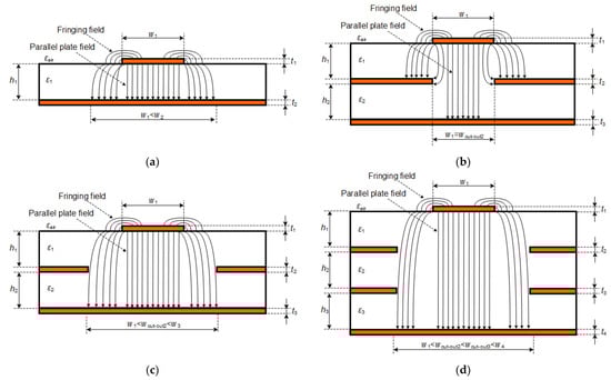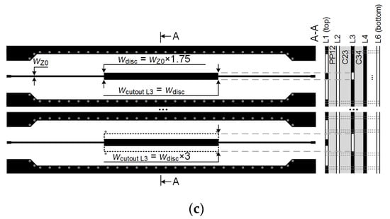 Figure 1d. This allows a further increase in the characteristic impedance and possibly makes it closer to the target 50 Ω line impedance. However, even in these cases, the above cut-out must be close to or larger than the lowest cut-out in order to not form fringing capacitances in the respective layers and to maximally compensate for the characteristic impedance.