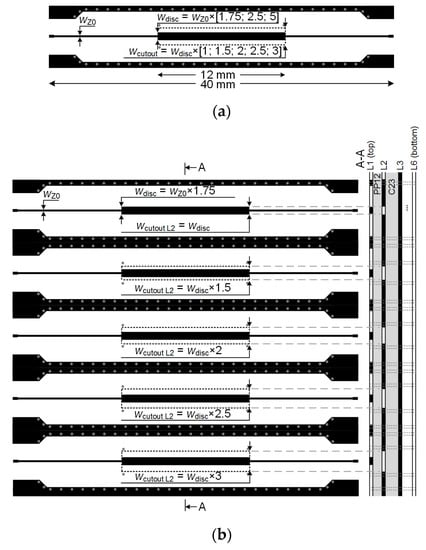 Figure 4. Only three dielectric layers were defined in the stack-up during the test-bench setup, thereby simplifying the simulation process and taking into consideration that the stack-up is symmetric. A separate layout for each of the three simulated microstrip lines has been designed: a reference 50 Ω microstrip; a 50 Ω microstrip with a discontinuity and with no cut-out compensation; and a 50 Ω microstrip with a discontinuity and a width-varying cut-out for impedance compensation. The cut-out width is varied using a linear parametric analysis and ranges from 0.674 mm (corresponds to a discontinuity width of 100%) to 2.022 mm (corresponds to a discontinuity width of 300%) with a step of 0.1685 mm (a 25% of cut-out increase every step). The simulation results presented in
