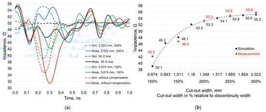 Figure 5b, containing only the impedance values at the center of the discontinuity (the value seen at 0.25 ns or 0.3 ns, depending on whether it is a simulation or a measurement curve). This graph describes the dependence of impedance over different cut-out sizes at a 1:1.75 track-to-discontinuity ratio, providing ten simulation and five measurement points. Not all simulation points (cut-out sizes) were included into the final fabricated PCB to reduce the PCB dimensions and manufacturing costs. Analyzing the latter graph, the impedance transitions to the saturation state with a cut-out size of approximately 250% and its change with a further increase in the size of the cut-out is very small. For example, at a 100% cut-out size, the impedance was measured to be about 42.2 Ω. Impedances of 53.3 Ω and 55.8 Ω were measured at a 200% and 300% cut-out size, respectively. It should also be noted that the larger the size of the cut-out, the more precisely the simulations replicate the measurement results. The theoretical evaluation showed an optimum ratio between cut-out and discontinuity equal to