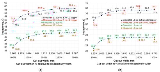 Figure 6b), the saturation region is observed at a slightly smaller cut-out size range of 150% to 200%. The impedance settles at (37–38) Ω and at (26–27) Ω, when cut-outs are in the L3 and L2 inner layers, respectively. The theoretical evaluation showed an optimum ratio of