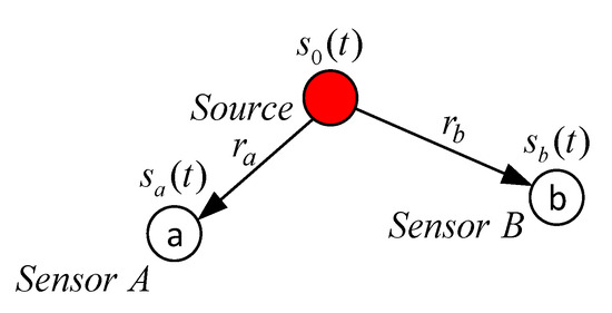 where τa, τb are lag values; αa, αb are signal attenuation coefficients; nA(t), nB(t) are random uncorrelated additive microphone noises. The values of τa, τb are determined by the geometric distances ra, rb from the signal source to the corresponding receiver