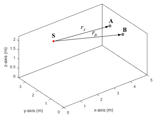 Source and microphones configuration in the model room. Source located in position S. Microphones are in positions A, B. Distances are rA = 3.041 m, rB = 3.354 m.