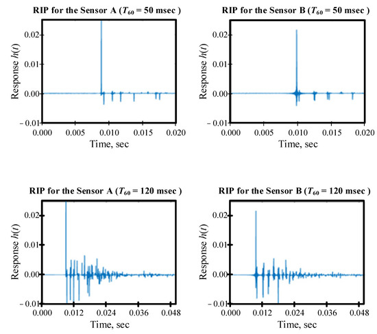 The reverberation time (T60) was assumed to be 50 msec and 120 msec. The first value is compliant with the standards of a room intentionally designed for voice broadcasting. The second value is compliant with the requirements for verbal communication in an office space [26]. The synthesized RIRs are shown in Figure 4.