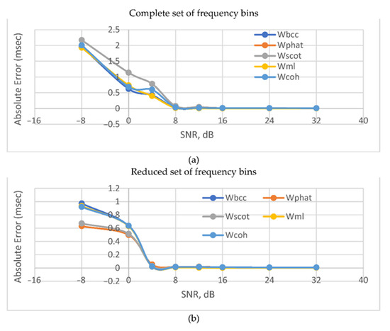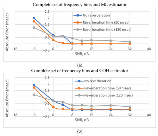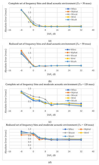 Figure 8 shows that in the presence of reflected signals, the ML estimator is inferior in accuracy to the SCOT and COH estimators, especially in the absence of additive noises. At the same time, the accuracy turns out to be significantly lower than in the previous case. This can be explained by the correlation of the signals with their reflected copies. In the presence of reverberations and intense noises, none of the functions show any accuracy advantage. The latter makes it useful to apply the BPS TDE method (PHAT) as the simplest one.