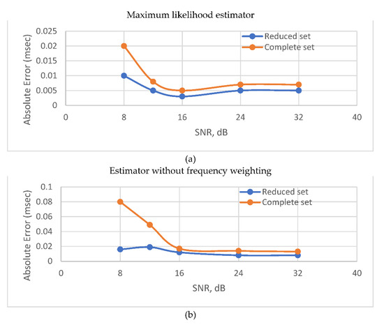 Figure 5 shows that the use of a reduced number of frequency bins in (15) and (16) provides greater accuracy while increasing the intensity of in-band noises. At the same time, the use of the second reduced frequency set allows you to reduce the threshold SNR to 4 dB over which sharp drop in the accuracy manifests.
