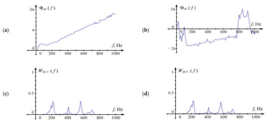 Figure 7 shows the form of Φab (fk) and all W(fk) in the absence of noise (SNR = 32 dB) and their presence (SNR = 4 dB). A part of the curve that is close to linear shape is clearly distinguished at Φab, in both cases, however, in the presence of noise, the corresponding frequency range is significantly narrower. It should be noted that Φab in the absence of noise passes through the origin and behaves as described in [14]. However, when the signal is contaminated with the noise, Φab is offset relative to the abscissa axis. This can be explained by the fact that there is no voice signal on frequencies up to 100 Hz, so the prevalence of the noise in this band results in an unpredictable offset of the unwrapped phase spectrum. That makes the estimation technique proposed in [14] not relevant for this task.