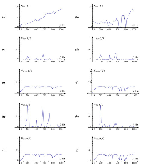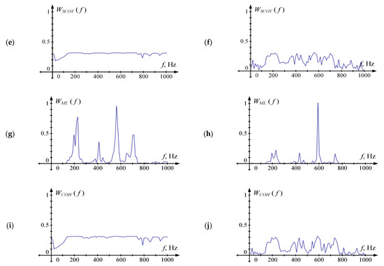 It is clear from (14) that the functions W(fk) should be chosen in the way that its value is high if the useful signal prevails over noises at the fk frequency and differs little from zero in other cases. A set of five frequency weighting functions was investigated in [14]. Table 1 below shows the calculation formulas for these functions.