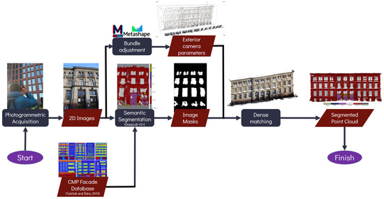 The aim of the study is therefore to propose a method which may benefit from both the abundance of 2D training data for DL purposes and the rigour of photogrammetric computations to create a faster and more precise approach to 3D point cloud semantic segmentation. To this end, in this paper we propose a practical and fully automatic workflow from images to classified 3D point clouds. As a proof of concept, the workflow was implemented within the context of close-range photogrammetry for architectural surveying purposes, e.g., building facade modelling. The input of the said workflow is 2D images acquired according to photogrammetric principles and oriented using a classical image matching and bundle adjustment. A DL-based neural network trained on a database of rectified building facade images was then used to perform semantic segmentation on the oriented images. The segmented images were thereafter used in dense image matching to generate semantically rich and classified 3D point cloud. The workflow was implemented using the open source photogrammetric suite Apero-Micmac [47], with additional coding in Matlab. Additional comparison was also implemented in the commercial software Agisoft Metashape. As the readers shall observe in this paper, the proposed method may be adapted into other photogrammetric situations, e.g., aerial mapping or heritage documentation by simply adjusting the applied neural network. As far as the paper’s structure is concerned, the next section will explore some work related to the main idea presented in this paper. Section 3 will thereafter contain the main description of the proposed method, with experimental results and discussions presented in Section 4 and Section 5, respectively. Finally, Section 6 shall put forward arguments to the potential of the proposed method, its drawbacks, and some ideas for improvements.