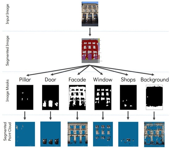 Parallel to the computation of the image orientation parameters, a neural network was applied on the input images to semantically segment them. To this end, a DL network of the DeepLabV3+ architecture [86] pre-trained using a ResNet-18 network [87]. Using the pre-trained network, further training was performed using an open dataset prepared by the Center for Machine Perception (CMP) of the Czech Technical University [88]. This dataset consists of 606 rectified images of building facades with varying types of architecture. This process of transfer learning was deemed adequate to perform the 2D semantic segmentation of the case study presented in this paper. Furthermore, the images were classified into six classes: “pillar”, “door”, “facade”, “window”, “shops” and “background”. The “shops” class refers to business signs and plaques. Note that this setup is more or less identical to a previous study as referred in [40].