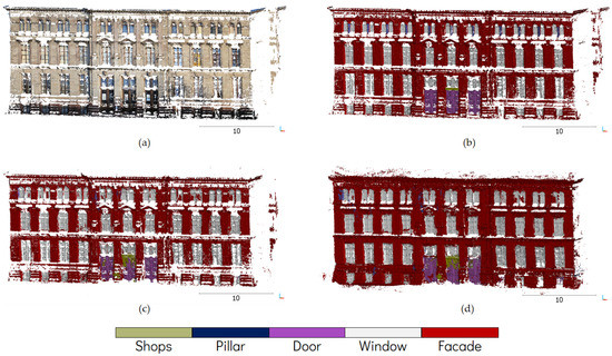 For the purposes of this comparison, only three classes (“window”, “door” and “facade”) shall be compared since both the “shops” and “pillar” classes were grossly underrepresented in the training data for PointNet++. This is owed to the fact that within the Zoological Museum dataset these two classes do not present adequate data, whereas they are not negligible in the CMAP image dataset used for the training in this paper.