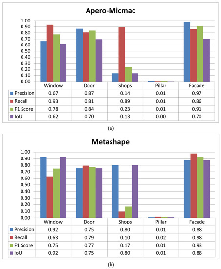 Table 1 shows the confusion matrix for the proposed semantic photogrammetry method applied to the software Micmac. Note that the assessment does not include the “background” class which was not considered particularly pertinent overall (see, however, a technical application in Section 5.3). In general, the proposed method seems to show promising results judging from the number of correctly classified points. Similarly Table 2 shows the same matrix for Metashape. In addition, Figure 4 presents a comparison between the statistics obtained from both Micmac and Metashape. In both cases, the proposed method was able to perform well in detecting and segmenting important classes such as windows and doors. The good performance on the facade class is nevertheless expected since it constitutes the majority of labels in any building-related semantic segmentation. The results for the “shops” class, in this case defined as panels and business signs, seem to be better in Metashape than Micmac. This point may be further explained by the fact that Metashape generated a much denser point cloud than Micmac. Indeed, this issue might be related to the fact that Micmac employs a much stricter post-filtering of dense matching than Metashape in relation to problematic areas such as little or textureless objects and shadows [18].