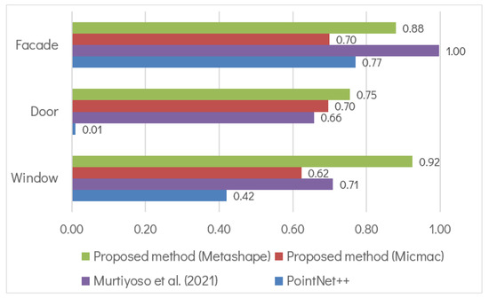 Figure 5 describes the comparison between these methods in a histogram representation. As can be observed from the figure, the proposed method shows a clear advantage in regards to PointNet++. Indeed, for PointNet++ the “door” class is virtually non-existent while the “window” class IoU score is less than 0.5. As has been mentioned before, this is a known issue in direct point-based 3D segmentation. The main reasons are usually related to inadequacy in terms of training data and point features, especially in the case of building openings. Compared to our previous approach in [40], the proposed semantic photogrammetry method presented an improvement with regards to the two building opening classes while the detection of facade remained better in this previous approach. However, this previous method is very limited to certain buildings with mostly flat facades and few architectural ornaments. The need to acquire not only the orthophoto but also a depth map to reproject the labels to the 3D point cloud may also present additional problems. This would be the case especially in heritage buildings with more complex types of architecture.