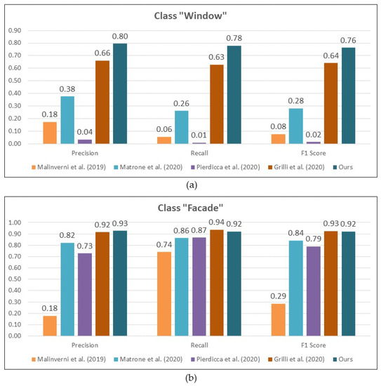 Finally, in order to further assess the results obtained especially in the case of building openings, a comparison was also performed to other studies which use AI-based semantic segmentation to perform the detection of openings, i.e., windows and/or doors. Four papers were identified, all of which were based on either an ML or DL, and are fairly recent. In Malinverni et al. (2019) [89], the authors used DGCNN to perform the task. Building upon this, Pierdicca et al. (2020) modified the base DGCNN architecture [41]. Matrone et al. (2020) [34] presented results not only from this modified DGCNN, but also the inclusion of 3D features during training. Finally, Grilli et al. (2020) [92] presented some results from their implementation of Random Forest (RF) algorithm.