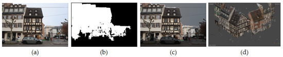 Example of concrete application of the proposed method in photogrammetric point cloud cleaning: (a) original image, (b) mask of all classes except “background”, (c) mask applied to the original image and (d) 3D point cloud from dense image matching using the masked image.
