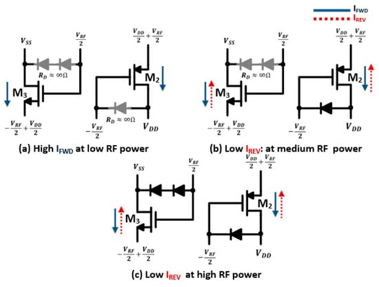 ) due to the symmetricity of the circuit. During the negative half cycle of the input RF signal, the rectifying devices (M
