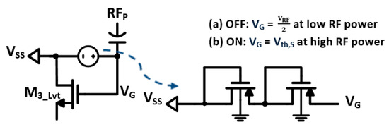 Figure 4b. The body voltage of the diode is tied to the RF input voltage, which forms adaptive threshold voltages. During the positive half-cycle of the input RF voltage, the diode (D