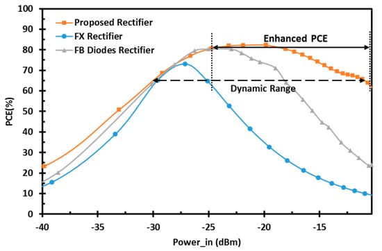 11]. The proposed rectifier offers the highest peak PCE of 82.2% and maintains 80% of its peak PCE from the low to high power levels, which corresponds to a DR of 18.45 dB. The proposed design has 17 times better DR than the conventional FX rectifier and 5.7 times better DR than the FB diodes rectifier in 65 nm CMOS technology. In addition, the sensitivity of the proposed design is shown in