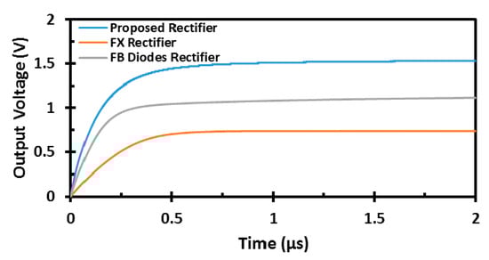 Figure 8 shows the transient simulation of the output DC voltage for the different architectures at high RF power levels. The proposed design achieves better output DC voltage at −15 dBm input RF power level with a 100-KΩ load for a load capacitance of 0.1 nF.