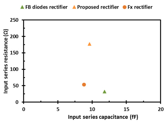 Figure 9 shows the input impedance of the proposed rectifier with the different architectures. The proposed design has an input series resistance and capacitance of 177.2 Ω and 9.6 fF, respectively. The matching network can be implemented to match the input impedance of the rectifier to the designed antenna for the largest total efficiency.