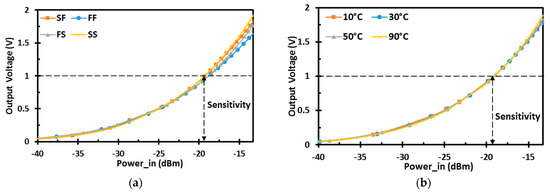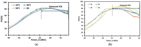 Figure 10a shows the variation of the PCE of the proposed design for the temperature range from 10 °C to 90 °C. The proposed design has low temperature sensitivity and maintains the enhanced efficient operating region from the low- to the high-power levels. The PCE of the proposed rectifier at different process corners is shown in