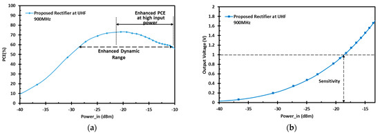 Table 1 compares the performance of the proposed architecture with the state-of-the-art RF CMOS rectifiers at a similar harvesting UHF band. To the best of the author’s knowledge, the proposed rectifier achieves the best DR, sensitivity, and low power performance reported to date, as shown in