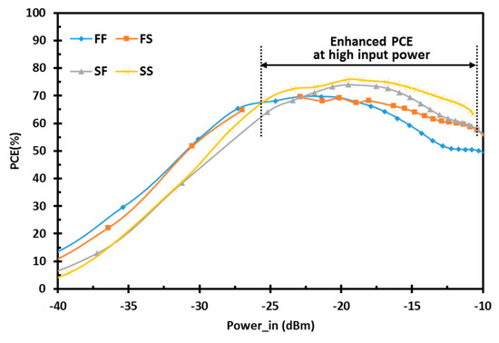 Figure 13a. The achieved peak PCE is 73%, and the proposed design maintains 80% of its peak PCE across the low- and high-power levels, which corresponds to a DR of 17.3 dB. Moreover,