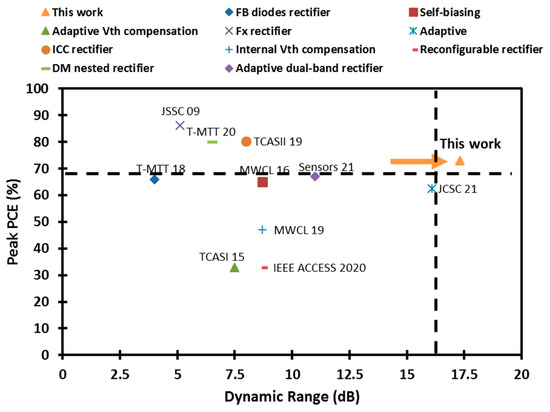 Figure 16 shows the peak PCE versus the DR of recently published architectures. The proposed design is the first-reported rectifier to cross the 17 dB DR boundary with an efficiency higher than 70% at the UHF band.