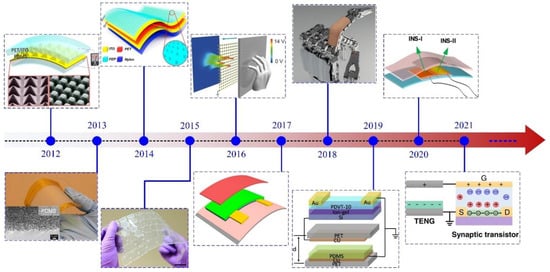 Brief timeline of tactile stimulator based on triboelectric nanogenerators. Reproduced with permission [41]. Copyright 2012, American Chemical Society. Reproduced with permission [21]. Copyright 2013, American Chemical Society. Reproduced with permission [22]. Copyright 2014, American Chemical Society. Reproduced with permission [33]. Copyright 2015, American Chemical Society. Reproduced with permission [43]. Copyright 2016, John Wiley and Sons. Reproduced with permission [44]. Copyright 2017, American Chemical Society. Reproduced with permission [48]. Copyright 2018, John Wiley and Sons. Reproduced with permission [49]. Copyright 2019, Elsevier. Reproduced with permission [50]. Copyright 2020, American Chemical Society. Reproduced with permission [51]. Copyright 2021, Springer Nature.