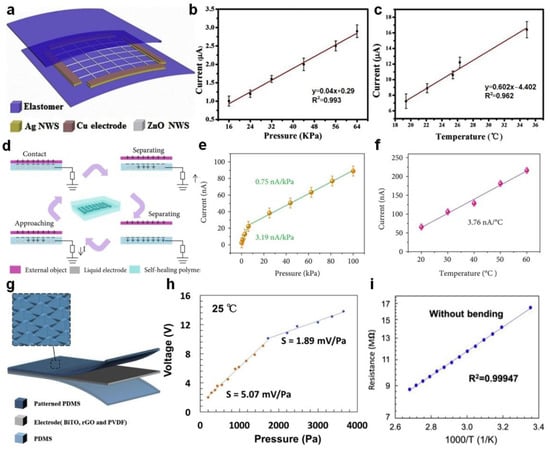In the tactile sensing system, the pressure and temperature are the two most common external stimuli [52,53]. In recent years, many active tactile stimulators based on TENG for pressure and temperature sensing have been reported, see Table 1 [54,55,56,57,58]. Chen et al. [54] reported an active tactile stimulator based on TENG through convenient inorganic modification which can realize the pressure and temperature sensing, respectively. Figure 2a shows the schematic diagram of the tactile stimulator, which is a typical structure based on the single-electrode mode. The dielectric layer consists of the polydimethylsiloxane (PDMS) and the organo-montmorillonite-cetyltrimethylammonium bromide. The electrodes consist of four composite electrodes formed by silver nanowires (Ag NWs) and copper (Cu) films interconnected by a network pattern of zinc oxide nanowires (ZnO NWs). These intrinsically stretchable materials enable the device to have a tensile function of up to 580%. When the external pressure is in the range of 16~64 kPa, the short-circuit current of the tactile stimulator increases linearly versus pressure, as shown in Figure 2b. The sensitivity can be calculated as 0.04 μA/kPa by the method of linear fitting. Figure 2c shows that the current of the tactile stimulator also increases with the applied temperature. When the temperature increases from 19.4 °C to 34.9 °C, the current increases from 7.2 μA to 16.4 μA, and the sensitivity is calculated as 0.59 μA/°C. In addition, the texture, hardness, and position of the measured object can be identified with a location detection sensitivity of 2 mm from the output waveform of the device. Similarly, Song et al. [55] reported a self-healing electronic skin by utilizing a TENG with single electrode mode, which also has the ability to sense pressure and temperature due to the triboelectric-electrostatic induction effect and thermal sensitivity mechanism. Figure 2d shows the working principle of the device, which senses the pressure and temperature of the measured object by detecting the output current of the device. At a pressure range of 0.12~6.25 kPa, the device exhibits a high sensitivity of 3.55 nA/kPa. With the increase of pressure, the sensitivity decreases to 0.70 nA/kPa (Figure 2e). This is mainly because the accumulation of triboelectric charge is closely related to the contact area. When the pressure increases, the contact area gradually saturates and the accumulation of triboelectric charge also reaches the saturation state, which reduces the sensitivity. The device uses temperature-sensitive ionic liquid as an electrode, which the resistance will be affected by the temperature, resulting in a change in output current. Figure 2f shows the linear relationship between temperature and output current with a temperature sensitivity is 3.76 nA/°C. Although these studies show that the tactile stimulator can sense pressure and temperature separately through the output current as a detection signal, the signal is easily disturbed under the simultaneous action of the two stimuli, making it difficult to sense pressure and temperature simultaneously. Therefore, it is necessary to develop devices that can respond to different signals under different external stimuli. Rao et al. [56] reported a tactile electronic skin based on TENG with a single electrode mode, which can be used for simultaneously detecting temperature and pressure (Figure 2g). The output voltage of the device is used for sensing pressure, with a sensitivity of 5.07 mV/Pa in 200~1720 Pa, and a sensitivity of 1.89 mV/Pa in 1720~3650 Pa (Figure 2h). The output voltage is positively correlated to the surface triboelectric charge, which is directly proportional to the contact area. Therefore, the high sensitivity is primarily attributed to the pyramidal microstructure on the surface of PDMS. The composite materials of Bi4Ti3O12 and reduced graphene oxide are used as the thermoresistive electrode of the device to sense the temperature change through the electrode resistance as the detection signal. The detection range of temperature for the device is 25~100 °C, which has high sensitivity and is not affected by pressure (Figure 2i). Due to the large internal resistance of TENG, the electrode resistance value can change in a large range without affecting the output of the device. And the detection of pressure and temperature is two different signals that do not interfere with each other, the ability to sense pressure and temperature is realized simultaneously. This research provides a new strategy for wearable sensing, and a new concept in the fields of medicine, prosthetics, and robots, etc.
